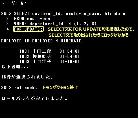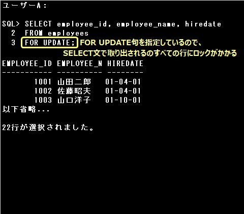 ①:SELECT文にFOR UPDATE句が指定されているので、SELECT文で取り出される行に排他ロックがかけられます。