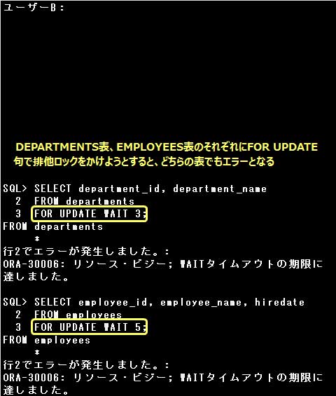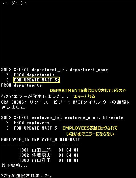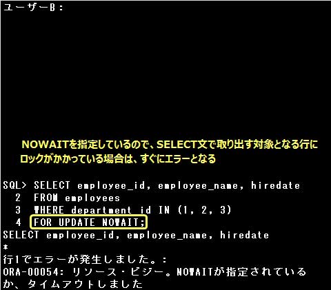 ②:①でユーザーAが排他ロックをかけているため、ユーザーBはSELECT文にFOR UPDATE句を指定しても排他ロックをかけることはできません。さらにNOWAITオプションを指定しているので、SELECT文実行後、直ちにエラーとなります。