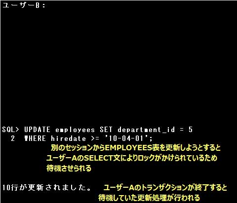 ③:①でユーザーAが排他ロックをかけているため、ユーザーBがUPDATE文実行時、ユーザーAがかけた排他ロックが解除されるまで待機します。