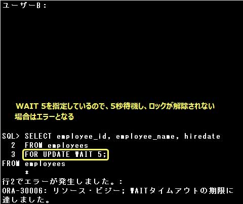 ①のSELECT文で「FOR UPDATE」を用いてロックを取得しようとしていますが、競合するトランザクションがすでにある場合には待たされます。「WAIT 10」は競合するトランザクションがすでにあった場合に「10秒までは待つ」という意味で、10秒経過するとエラーが返ります。