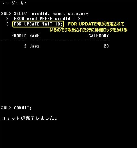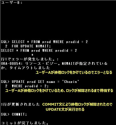また、解説③にはユーザーAがかけた排他ロックが解除されるまで待機するとありますが、これはユーザーBのSQL文でUPDATE prod SET name = 'Chopin' WHERE prodid = 2 の後に FOR UPDATE WAIT がありませんがデフォルトでそのような挙動になるのでしょうか?