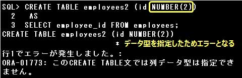 データ型は副問合せのSELECT句に指定した列のデータ型、または式の値のデータ型から自動的に定義されるため、CREATE TABLE文にデータ型を指定するとエラーとなります。