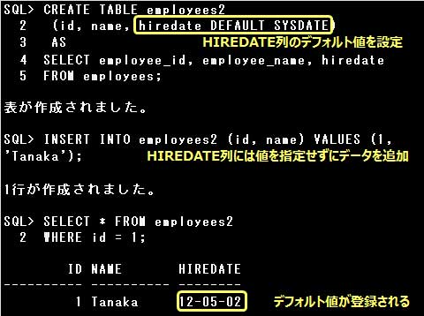 ただし、副問合せによる表の作成時にデフォルト値を設定したり、制約を定義することはできます。