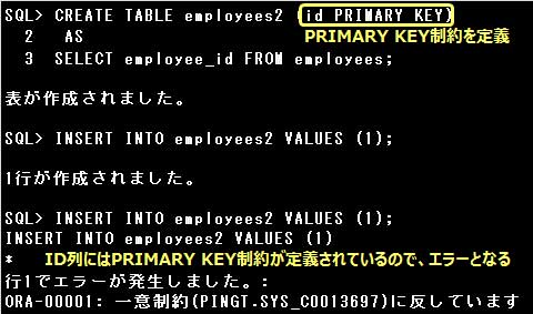 副問合せによる表の作成時、新たに作成する表に制約を定義することができます。