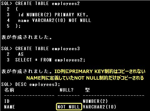 EMPLOYEES表のEMPLOYEE_ID列にはPRIMARY KEY制約が定義されていますが、明示的なNOT NULL制約は定義されていません。PRIMARY KEY制約の定義により暗黙的に作成されたNOT NULL制約は、副問合せによって新たに作成される表にコピーされません。明示的に定義されたNOT NULL制約だけが、副問合せによって新たに作成された表にコピーされます。