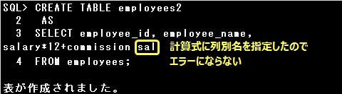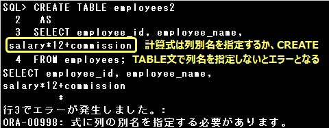 なお、副問合せのSELECT句に計算式や関数を指定する場合は、計算式や関数に列別名を指定するか、CREATE TABLE文で列名を指定しなければなりません。