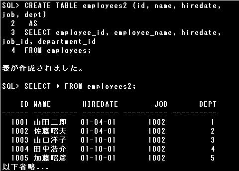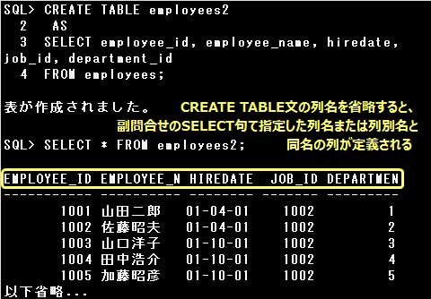 CREATE TABLE文の列名を省略すると、副問合せのSELECT句に指定された列名または列別名と同名の列が定義されます。