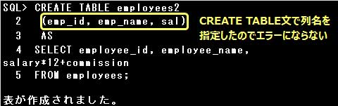 CREATE TABLE文に指定する列名の数と、副問合せのSELECT句に指定する列名(列別名)の数は、同数にしなければなりません。