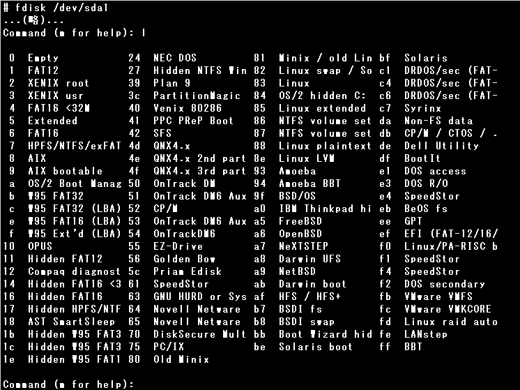 サブコマンド「l」でパーティションタイプの一覧表示を行えます。