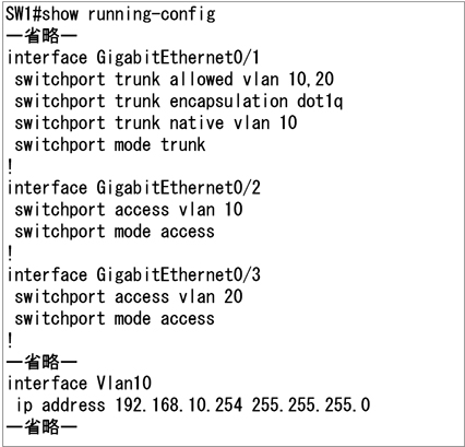 また、SW1には管理用IPアドレス「192.168.10.254」が設定されています。