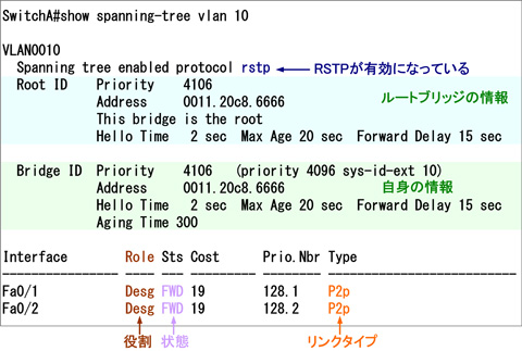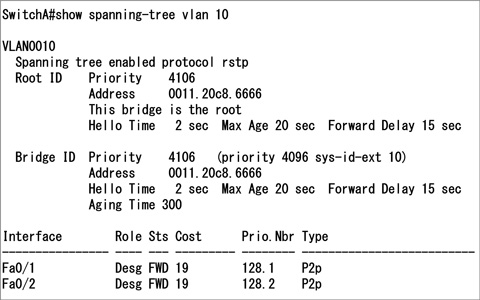 SwitchAのFa0/1とFa0/2の役割を確認すると、どちらも「Desg」(指定ポート)になっています。これより、SwitchAはVLAN10のルートブリッジであると読み取ることができます。