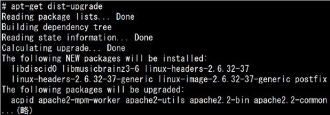 update: パッケージに関する情報を保持するデータベースを最新化するupgrade: インストール済みパッケージをバージョンアップするdist-upgrade: ディストリビューションをバージョンアップする