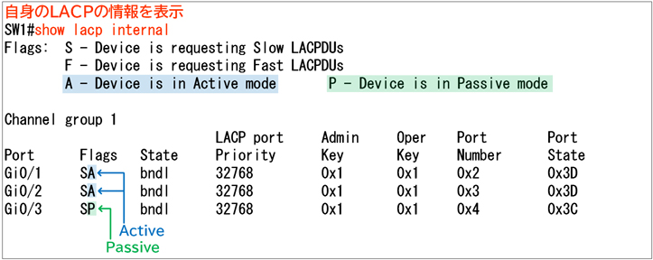 (1)自身のポートに設定されているLACPモードを確認:「show lacp internal」(SW1で入力)