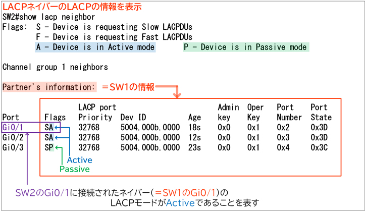 (2)LACPネイバーに設定されているLACPモードを確認:「show lacp neighbor」(SW2で入力)