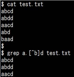 例)「test.txt」ファイルから正規表現の「a.[^b]d」にマッチする文字列が含む行を抽出する場合