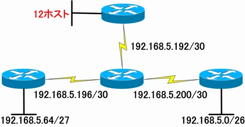 新しく12台のホストを持つサブネットの追加先ルータが「192.168.5.192/30」のネットワークと接続されているルータだと認識しています。