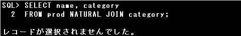 PROD表とCATEGORY表のデータを見ると、CATEGORY列とNAME列の値の組合せが一致する行は1つもないので、結合結果は1件も表示されません。