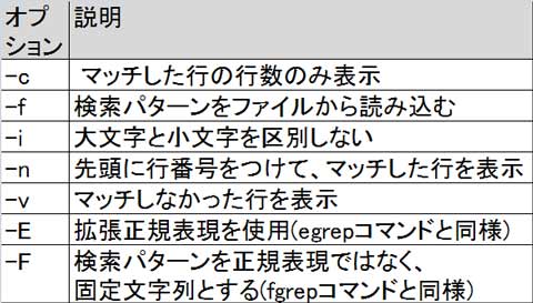 grepコマンドの書式と主なオプションは以下のとおりです。