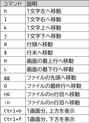 以下はカーソルおよび画面操作に関する主なviコマンドをまとめたものです。