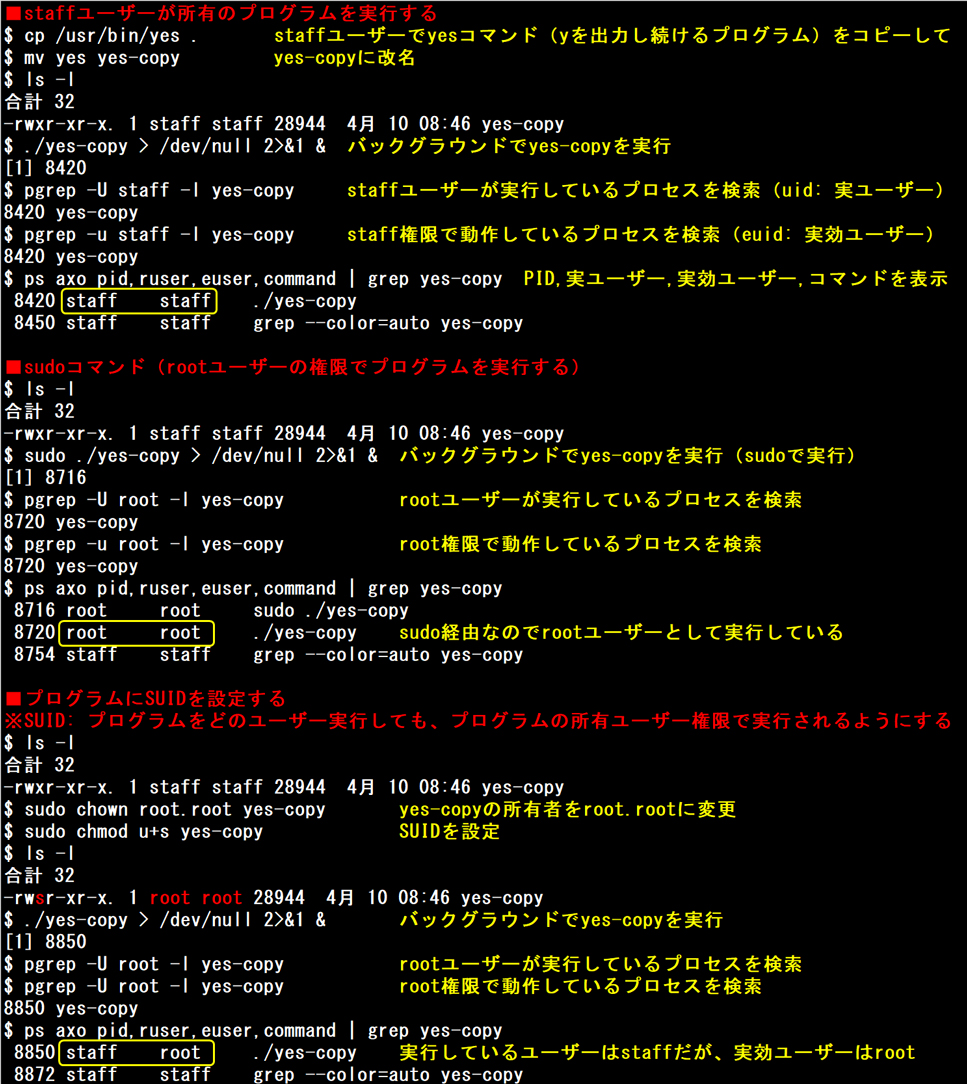 以下はプログラムのパーミッションなどによって実ユーザーや実効ユーザーが変わる例です。
