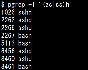 検索パターンには拡張正規表現が指定できます。-lオプションを使うと、検索パターンにマッチしたプロセス名も表示されます。