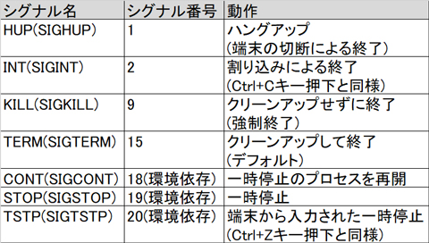 なお、killall、pkill(およびkill)コマンドでシグナルを指定しない場合は、デフォルトでこのシグナルが使用されます。