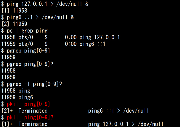また、killコマンドはジョブ番号を指定し、ジョブにシグナルを送る事もできます。ジョブ番号は「%ジョブ番号」と指定します。
