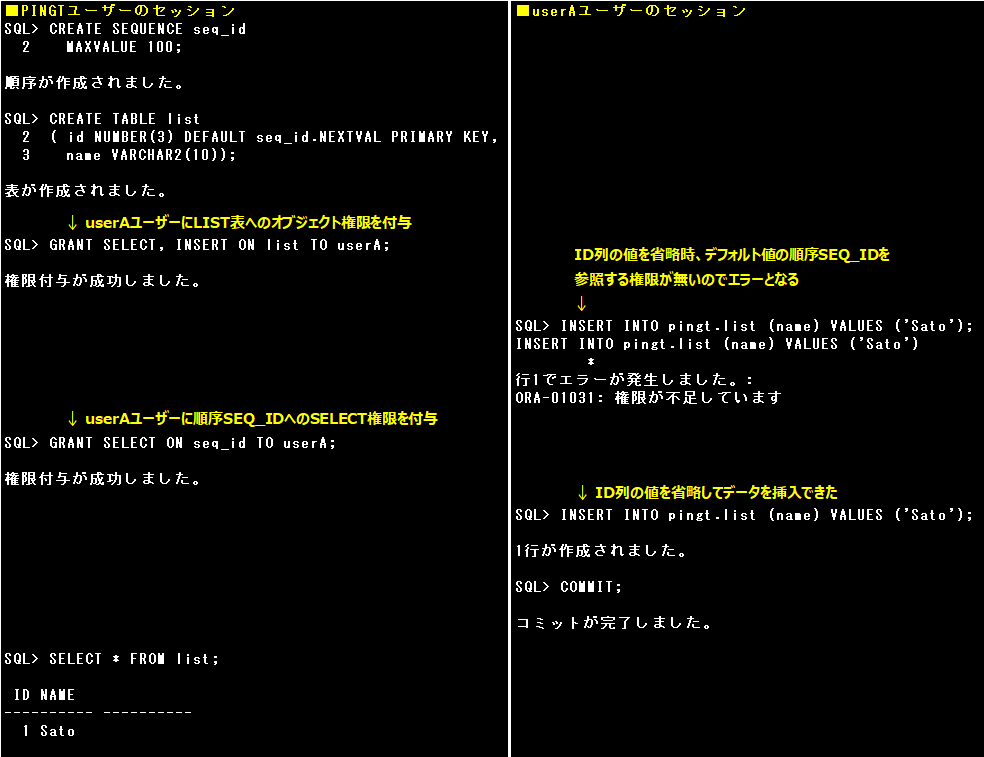 GRANT文では、userAユーザーにLIST表へのデータの参照と挿入に必要なオブジェクト権限を付与しています。これでuserAユーザーはPINGTユーザーのLIST表にデータを挿入することは可能です。ただし、ID列の値を省略する場合は順序SEQ_IDが使用されるので、順序SEQ_IDを参照するためのSELECTオブジェクト権限かSELECT ANY SEQUENCE権限が必要になります。