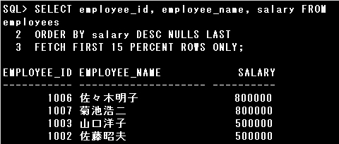 設問では給与の高い順に15%という条件ですので、まずORDER BY句でSALARY列を降順(DESC)にソートしますが、その際NULL値の行が先頭に表示されないようにNULLS LAST句を記述します。