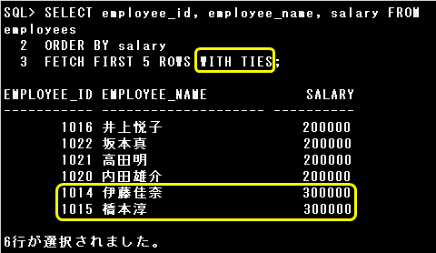 以下の例では、給与の低い順に5行返されるように指定していますが、WITH TIESキーワードも指定しているため最後にフェッチされた行と同じソートキーの値を持つ全ての行も返されます。ソートキーとはORDER BY句に指定した列のことなので、WITH TIESを指定する場合は、ORDER BY句を指定する必要があります。