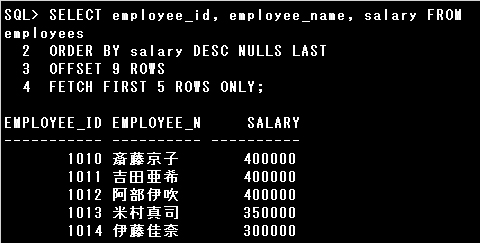以下の例では、給与の高い順から先頭の9行をスキップし、10行目から5行分の14行目までのデータを表示しています。ONLYキーワードを指定しているため、14行目と15行目が同じ給与であっても、14行目までしか表示されません。