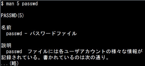 パスワードファイル(/etc/passwd)について調べたい場合は、セクション5を指定します。