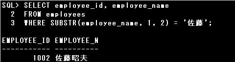 ・SELECT employee_id, employee_name FROM employees WHERE SUBSTR(employee_name, 1) = '佐藤';