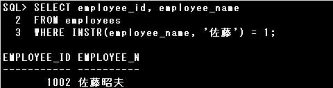 ・SELECT employee_id, employee_name FROM employees WHERE INSTR(employee_name, '佐藤') = 1;