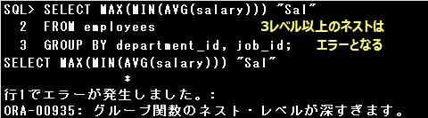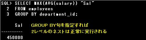 また、GROUP BY句を指定しても、グループ関数は2レベルまでしかネストすることができません。