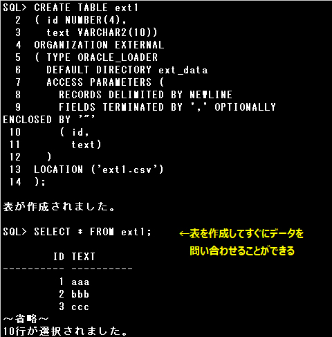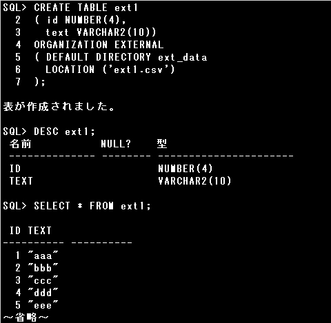 以下はORACLE_LOADERを使用してOS(Linux)上のテキストデータファイル「ext1.csv」をロードする外部表の例です。