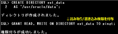 例)SYSTEMユーザーとして、パス「/usr/oracle/data」をディレクトリオブジェクトEXT_DATAとして作成し、オブジェクト権限をpingtユーザーに付与する
