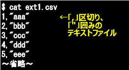 下図はOS(Linux)上にあるテキストファイル「ext1.csv」です。