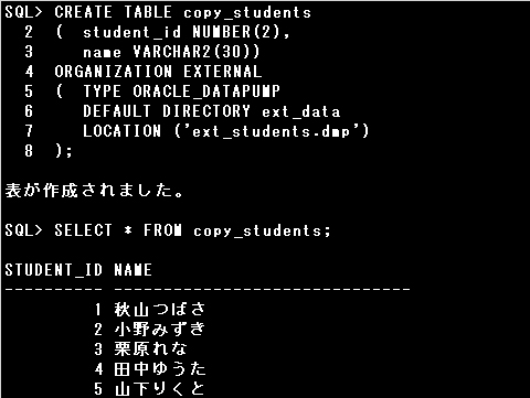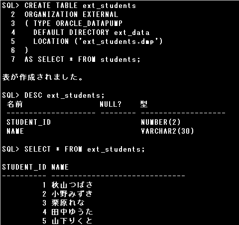 例)外部表EXT_STUDENTSを作成し、STUDENTS表のデータをダンプファイル「ext_students.dmp」にアンロードする