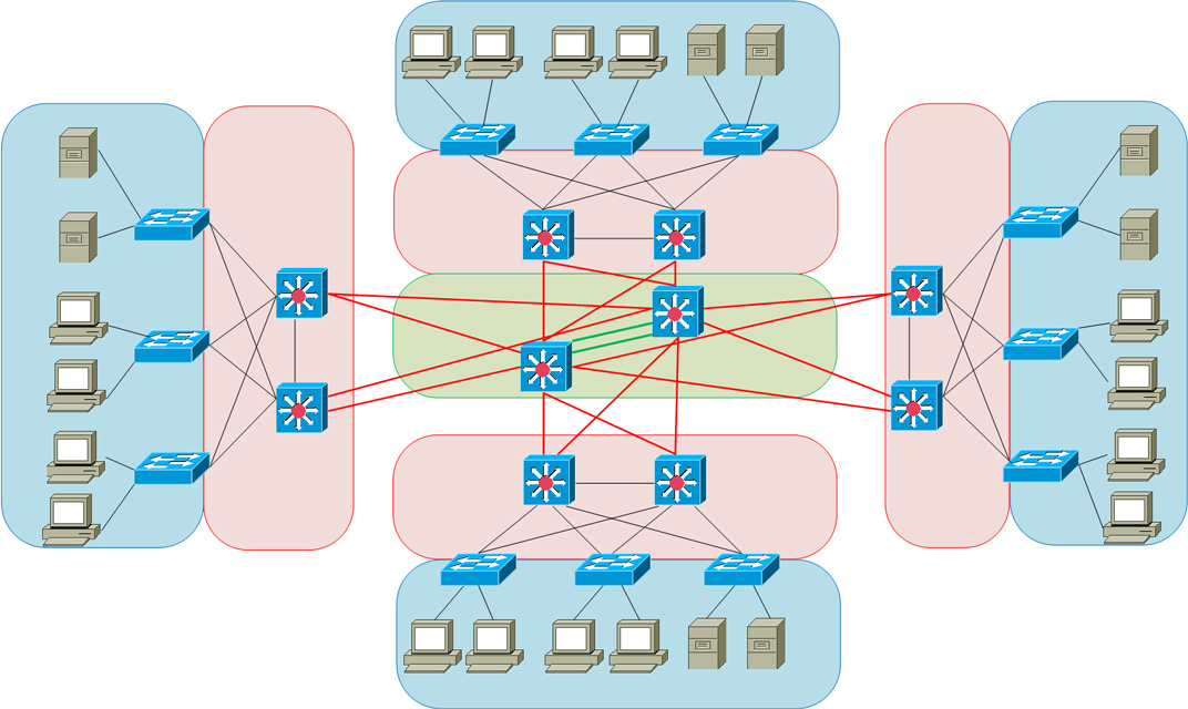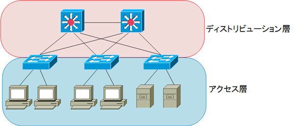 また、ディストリビューション層はアクセス層のスイッチを収容し、アクセス層にはエンドユーザが直接接続します。