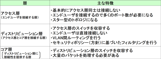 上表より、ディストリビューション層はVLAN間ルーティングを行うためレイヤ3ルーティングに対応する必要があることがわかります。