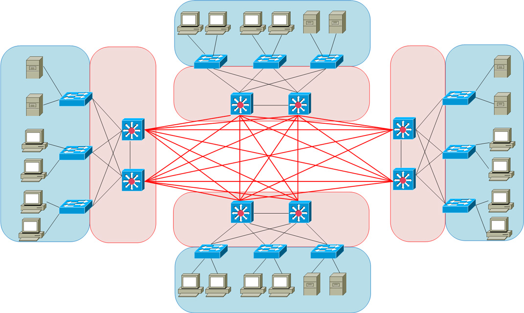 2階層キャンパス設計を採用した拠点同士を接続する場合、設計にもよりますが接続拠点が増えるたびに拠点間を接続するケーブル数が極端に増加します。