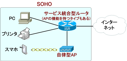 SOHO(Small Office/Home Office)とは、小規模オフィスや自宅兼事務所(在宅ワークなど)のような小規模なネットワーク構成を指します。