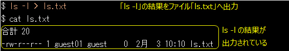例)lsコマンドの結果をファイル「ls.txt」へ出力する