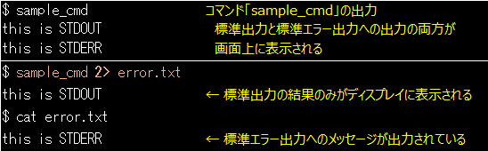 例)コマンド「sample_cmd」の標準エラー出力を、ファイル「error.txt」へ出力する