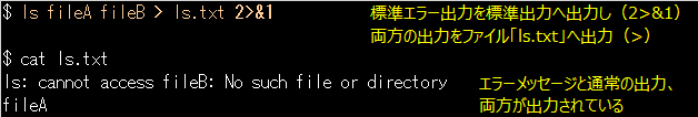 例)lsコマンドの標準出力と標準エラー出力を、ファイル「ls.txt」へ出力する