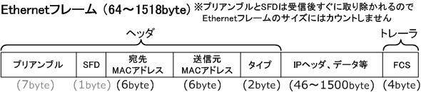 ・SFD(Start Frame Delimiter):フレームが始まることを知らせる目印(10101011)