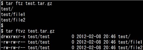 なお、tarコマンドではオプションの「-」は省略できます。オプションは順不同でも動作しますが、慣習的にはc, x, tのような動作オプションを先頭に指定します。