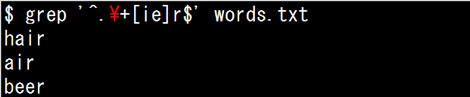 grepコマンドの検索パターンで拡張正規表現を使うには、-Eオプションを指定します(egrepコマンドと同様)。