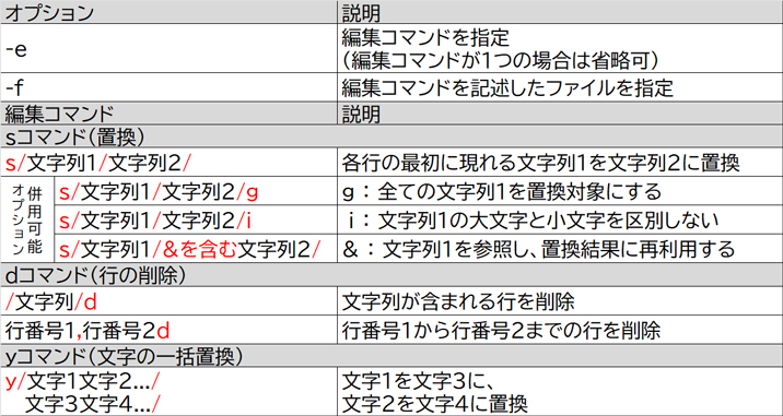 sedコマンドの書式と主なオプション・編集コマンドは以下のとおりです。